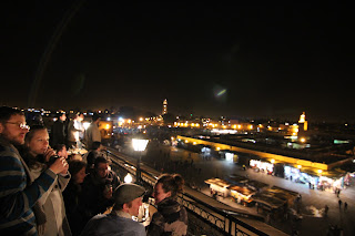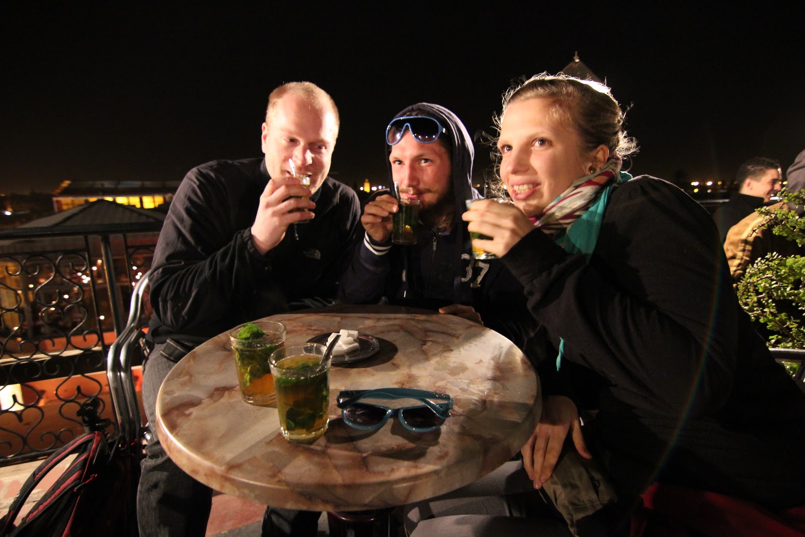 Erfahrene Afrikareisende wissen an diesen Abend gibt es nur einen Place-to-be nämlich den Djemaa el-Fna, wo der Bär bzw. der Affe und die Klapperschlange steppt. Wir wussten dies natürlich und hatten uns rechtzeitig um 23:06 einen Platz reservierten. Sofort bestellten wir ein Runde Thè du Menthe. Der Haute aber so rein das uns der Kellner schon die zweite Runde verweigerte.