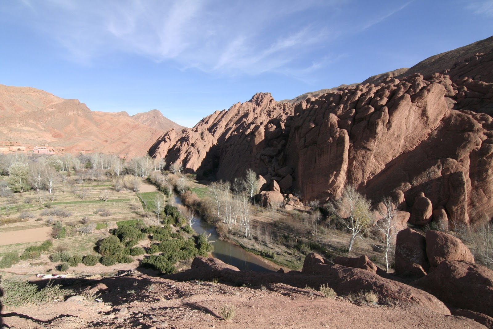Noch vor dem Frühstück rückte die Filmcrew aus um am nahe gelegenen Fluss u ein paar Lines im bröckeligen Gestein aufzunehmen. Rebecka und Henno hatten es besser, sie schliefen aus, danach sollte es sofort losgehen zu Dades-Schlucht.