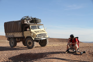 Das Foto zeigt einen echten Marokkaner und bei genauem hinschauen einen verrückten mit nur einem Rad im Sand.