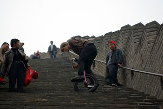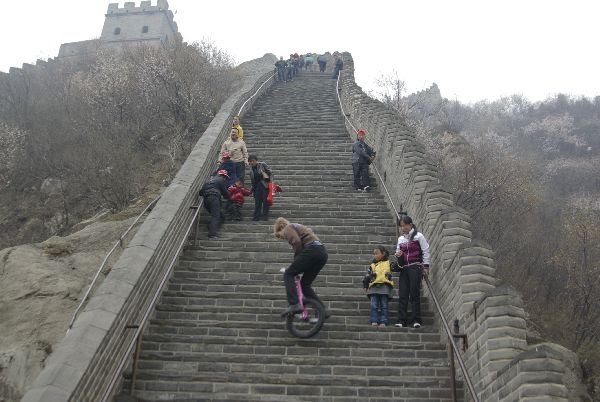 Heute ging es zur 1,5 Autostunden entfernten chinesischen Mauer die wir bei schlechten Wetter besichtigtenAuch hier waren wieder sehr viele chinesische Touristen die erstaunt zuschauten wie ich mit dem Einrad auf der Mauer herumsprang.
