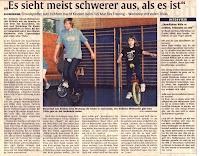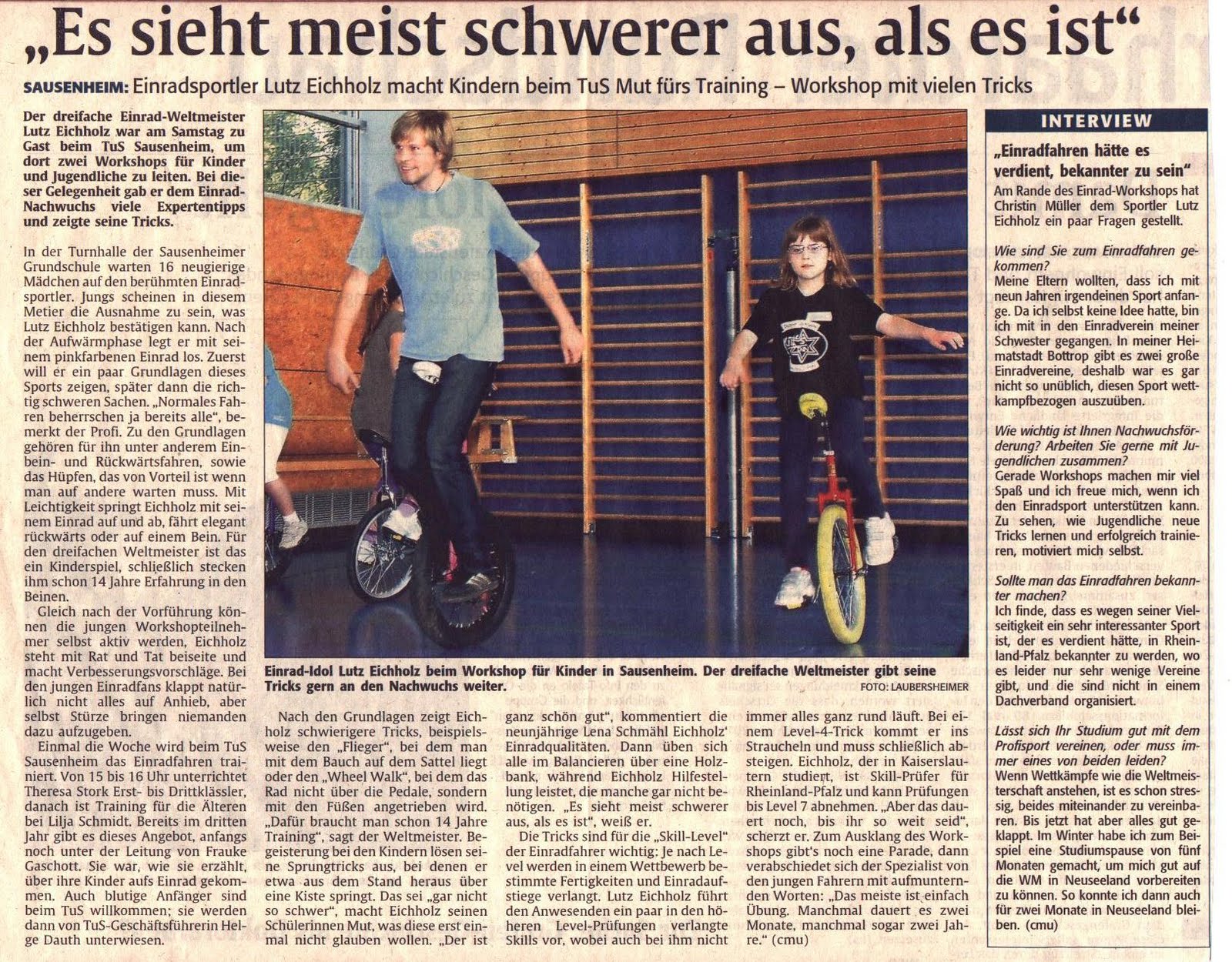 Vor ein paar Wochen habe ich einen Einrad Workshop in Sausenheim gegeben. Die Organisatoren waren so nett mir einen Scann des Zeitungsartikels den die Lokale Presse über den Workshop gemacht hat zu schicken. Zur größeren Ansicht des Artikel einfach aufs Bild klicken.